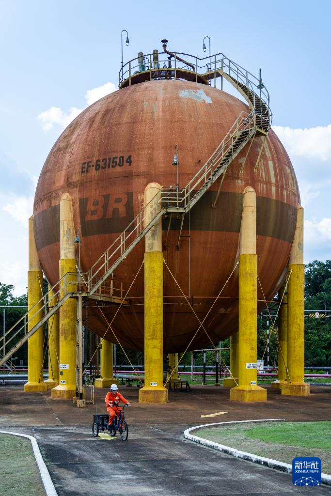 10月16日,在巴西亚马孙州的乌鲁库油气生产基地,一名工作人员骑行经过液化石油气储罐。