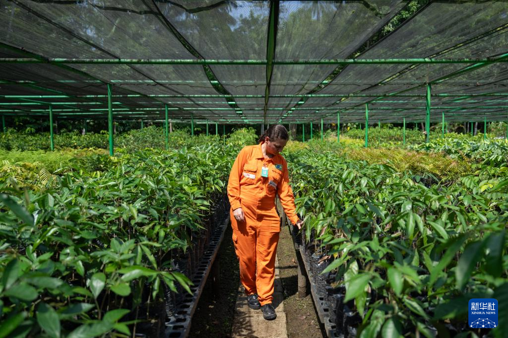 10月17日,在巴西亚马孙州的乌鲁库油气生产基地,一名工作人员在生态苗圃内检查幼苗生长情况。