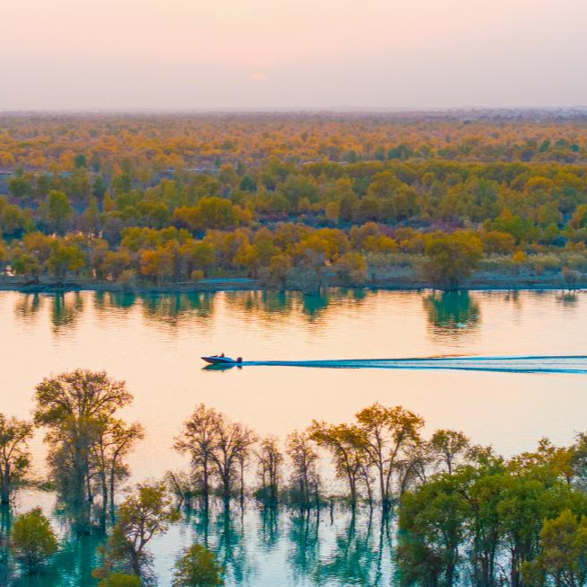 金秋时节,新疆巴音郭楞蒙古自治州尉犁县境内的沙漠胡杨景观与塔里木河互相映衬,美不胜收,吸引不少游客观光游览。