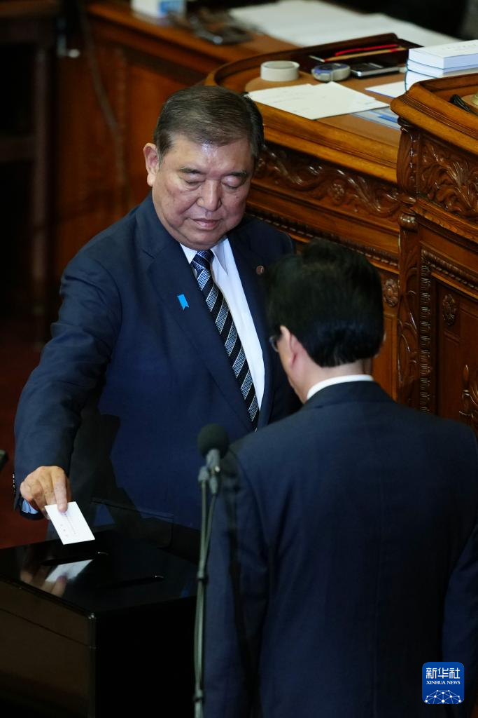10月21日,在日本东京,前首相石破茂(左)参加临时国会众议院首相指名选举投票。