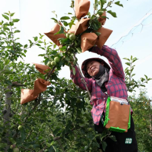 6月10日,果农在白水县仙果苹果专业合作社的果园里给苹果套袋。
