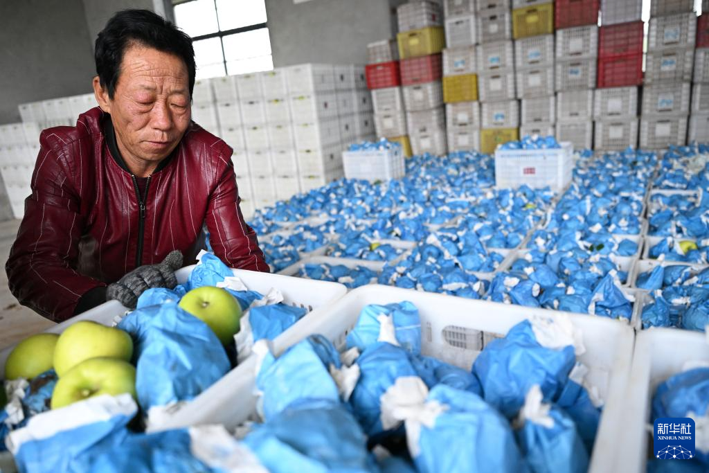 10月18日,在渭南市白水县秋林苹果专业合作社的果园里,果农林秋芳采摘“瑞雪”苹果。