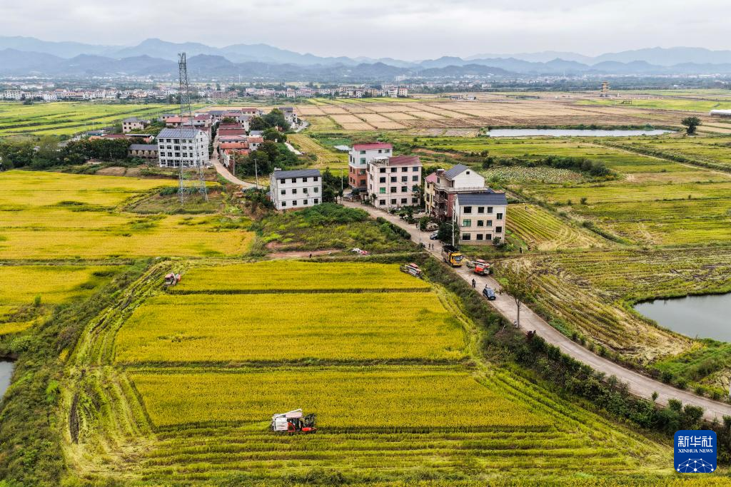 金秋时节,浙江省金华市金东区塘雅镇万亩良田示范区的水稻迎来集中收割期,收割机在稻田来回穿梭,抢抓农时收割水稻。塘雅镇作为金东区最早开展“多田套合”试点的片区,累计建成永久基本农田1万多亩,从育种到收割全程实现机械化、智能化。