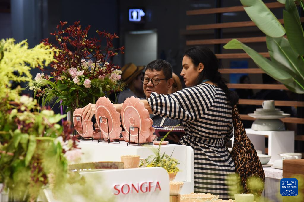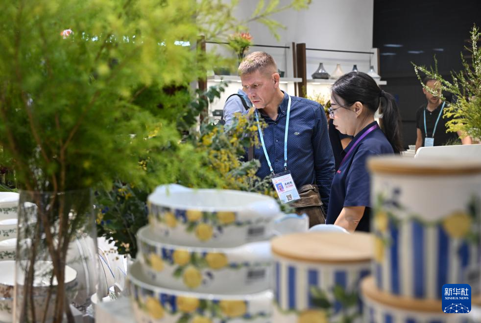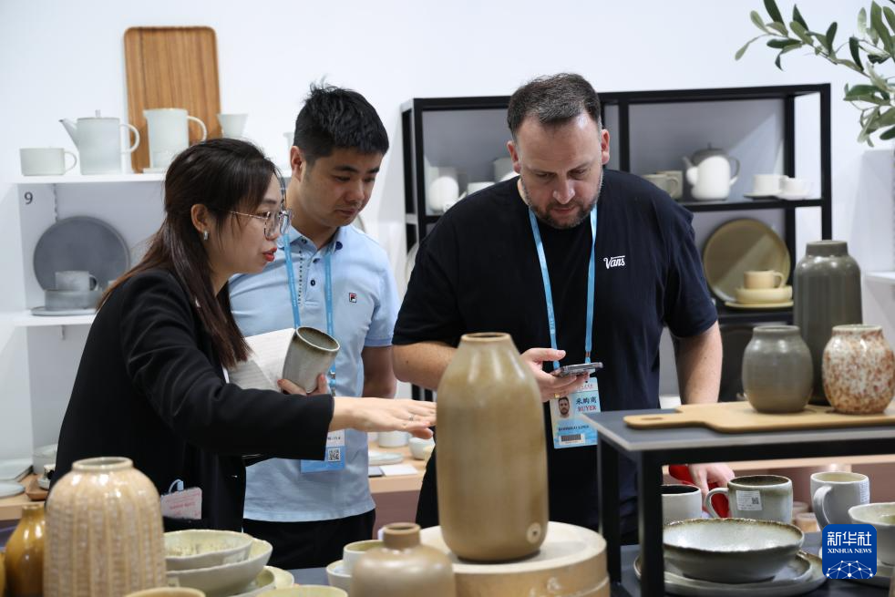 10月23日,境外采购商在日用瓷器企业展台洽谈。