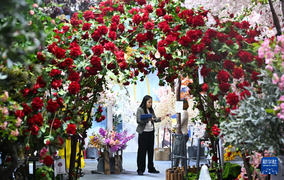 10月23日,工作人员在仿真花展台洽谈。