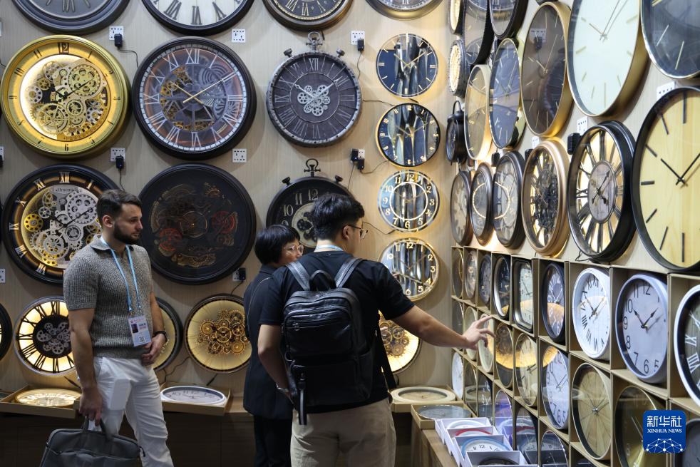 10月23日,客商在广交会上参观选购钟表。