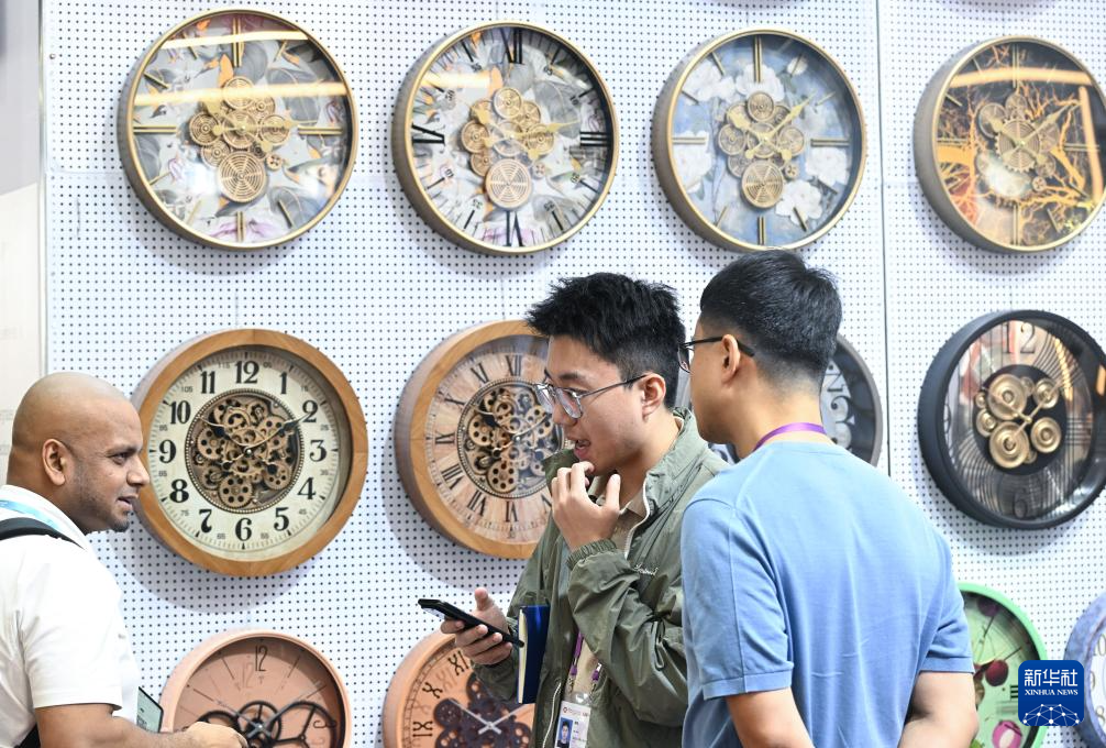 10月23日,境外采购商在钟表展台洽谈。