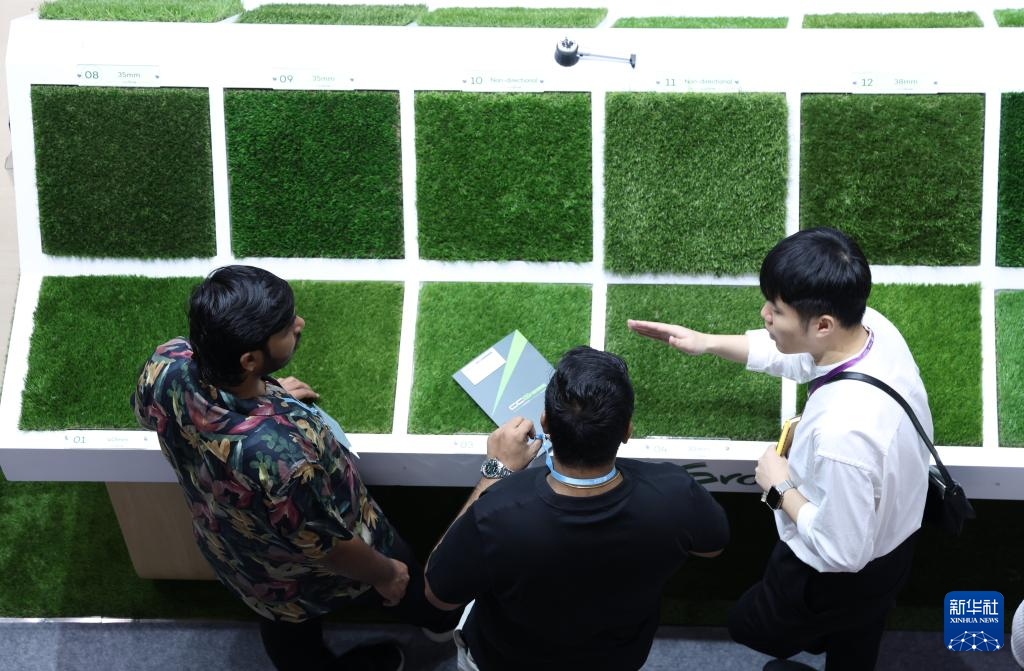 10月23日,客商在广交会上参观选购人工草坪。
