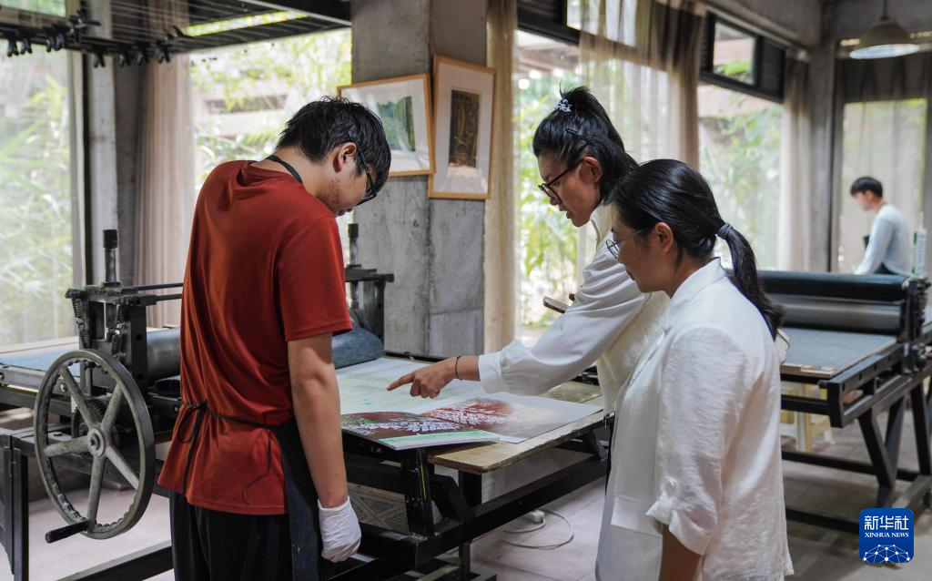 10月22日,在云南普洱学院那柯里绝版木刻教学实践基地,老师与学生交流版画技艺。