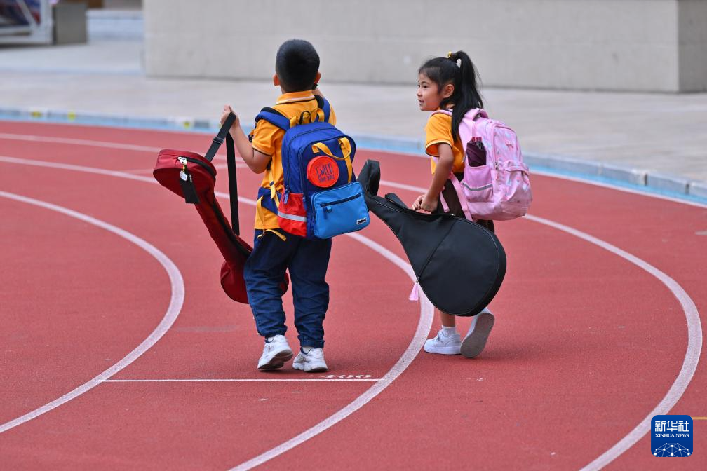 10月23日,在福建省晋江市实验小学,两位上南音课的学生下课后走在校园操场上。