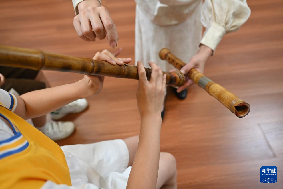 10月23日,在福建省晋江市实验小学,南音艺术家蔡丽永指导学生吹箫指法。