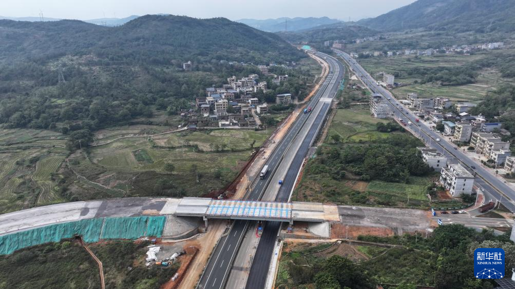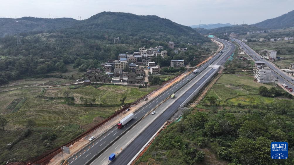 这是10月24日在京港澳高速耒宜改扩建工程宜章段施工现场拍摄的宜章北枢纽互通(无人机照片)。