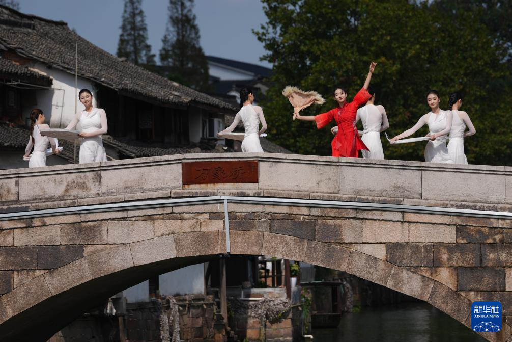 10月24日,浙江歌舞剧院演员在新市古镇表演舞蹈《富春》。