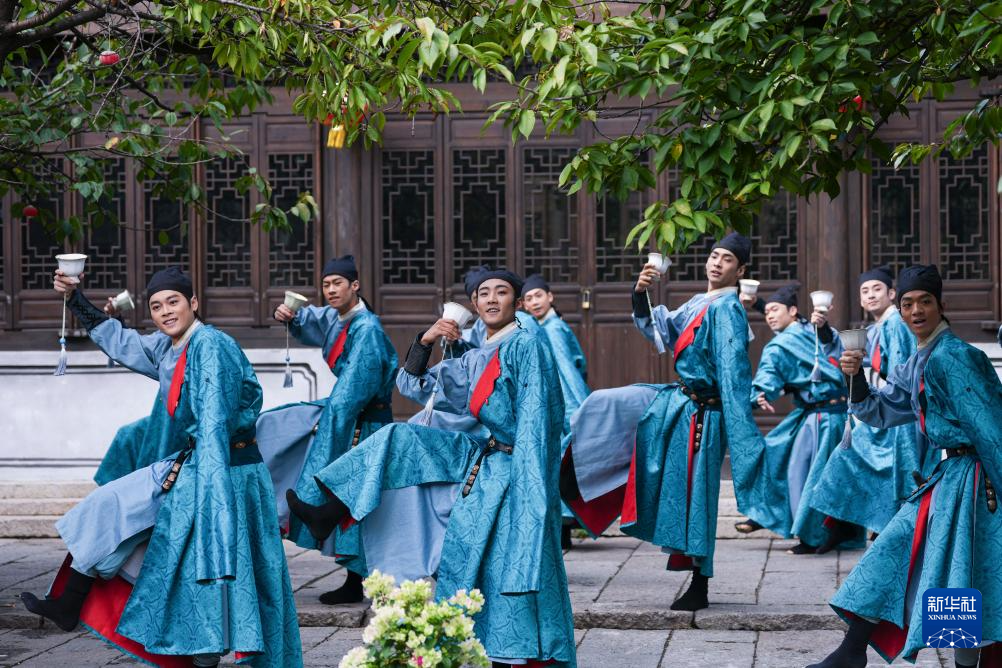 10月24日,浙江歌舞剧院演员在新市古镇表演舞蹈《鹿鸣宴》。