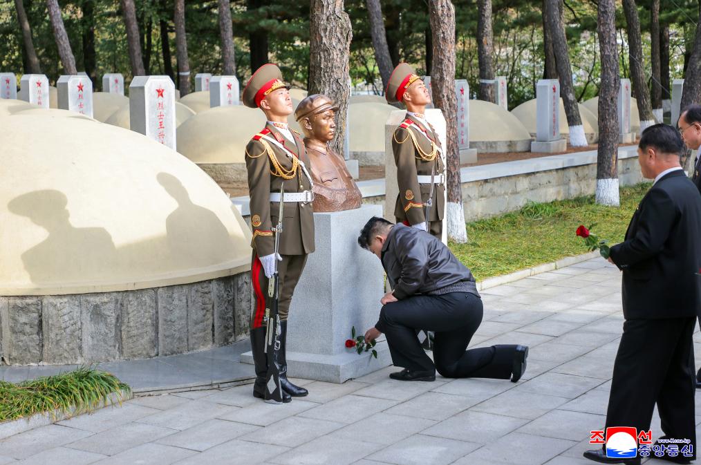 10月24日,在朝鲜平安南道桧仓郡的中国人民志愿军烈士陵园,朝鲜劳动党总书记、国务委员长金正恩凭吊毛岸英烈士墓并献花。