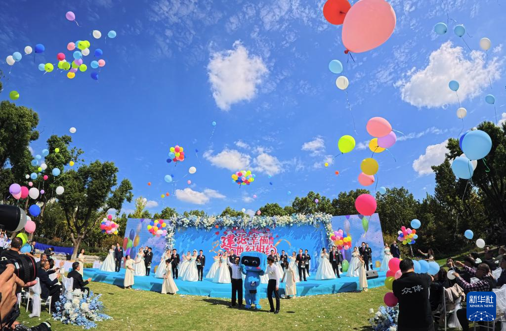 10月25日,新人们在集体婚礼现场向来宾抛喜糖。