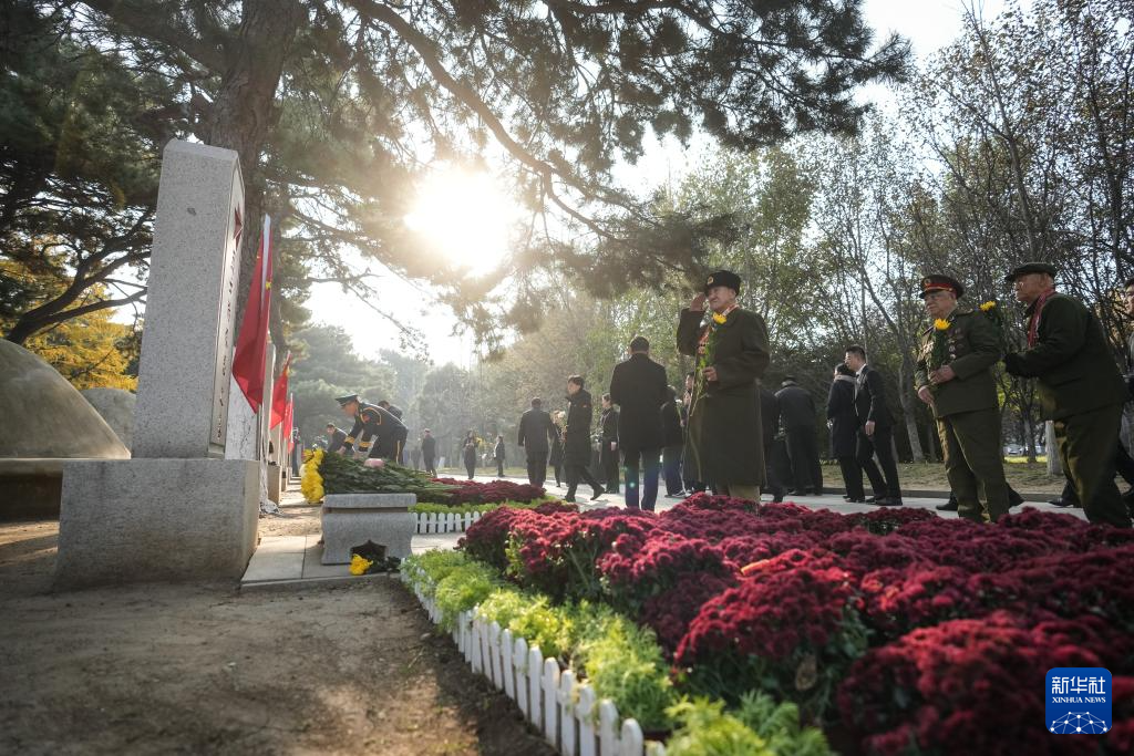 10月25日,志愿军老战士在沈阳抗美援朝烈士陵园仪式现场向烈士墓献花。
