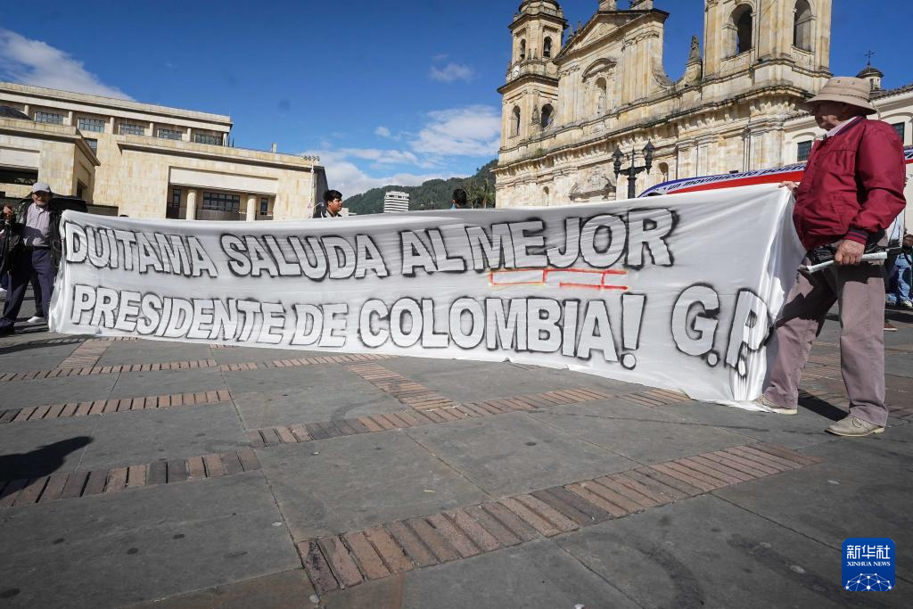 10月24日,在哥伦比亚首都波哥大的玻利瓦尔广场,人们手持支持总统佩特罗的标语。