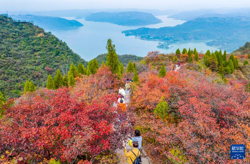 10月25日,游客在河南省洛阳市新安县荆紫仙山景区观赏红叶(无人机照片)。