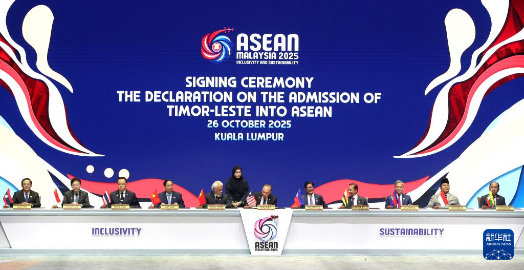 10月26日,在马来西亚首都吉隆坡,老挝总理宋赛、新加坡总理黄循财、泰国总理阿努廷、越南总理范明政、东帝汶总理夏纳纳、马来西亚总理安瓦尔、菲律宾总统马科斯、文莱苏丹哈桑纳尔、柬埔寨首相洪玛奈、印度尼西亚总统普拉博沃、缅甸代表(前排从左至右)签署《东帝汶加入东盟宣言》。