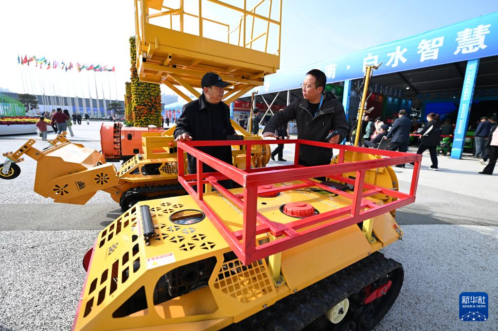 10月26日,参观者在第32届杨凌农高会上了解渭南君创飞科技有限公司的履带果园管理机。