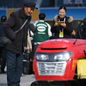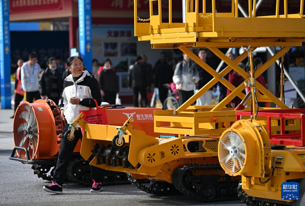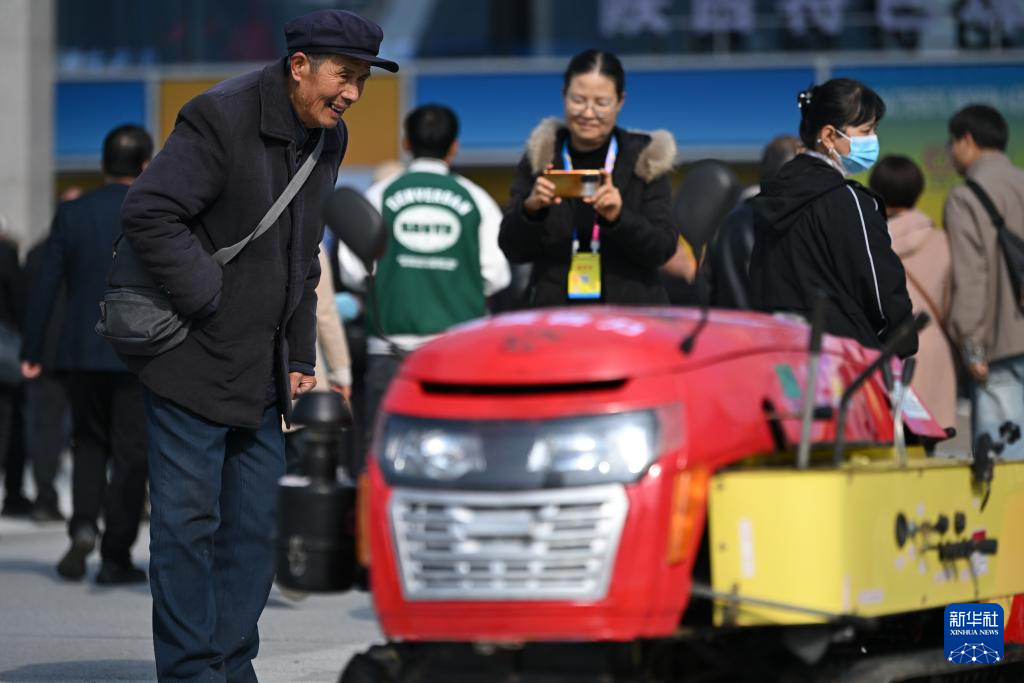 10月26日,参观者在第32届杨凌农高会上了解鲁力农机的履带自走式多功能微耕机。