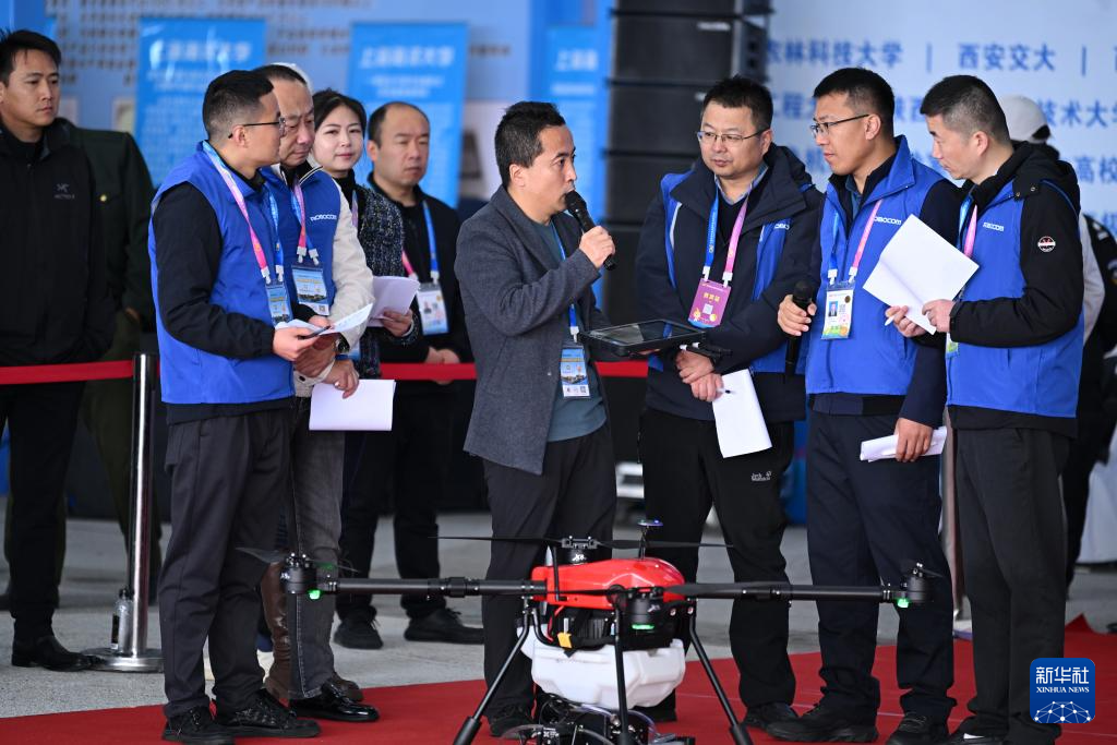 10月26日,在第32届杨凌农高会的农业机器人比赛上,陕西华基枫林科技有限公司的技术人员(前中)向评委介绍参赛的农用无人机产品。