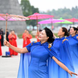 10月29日,民间艺人在浙江省湖州市德清县第十届舞阳侯会非遗巡游活动上进行民俗表演,庆祝重阳节。