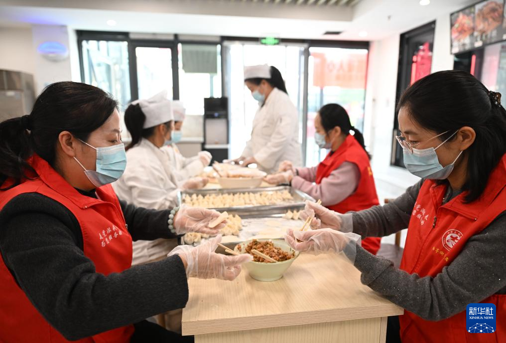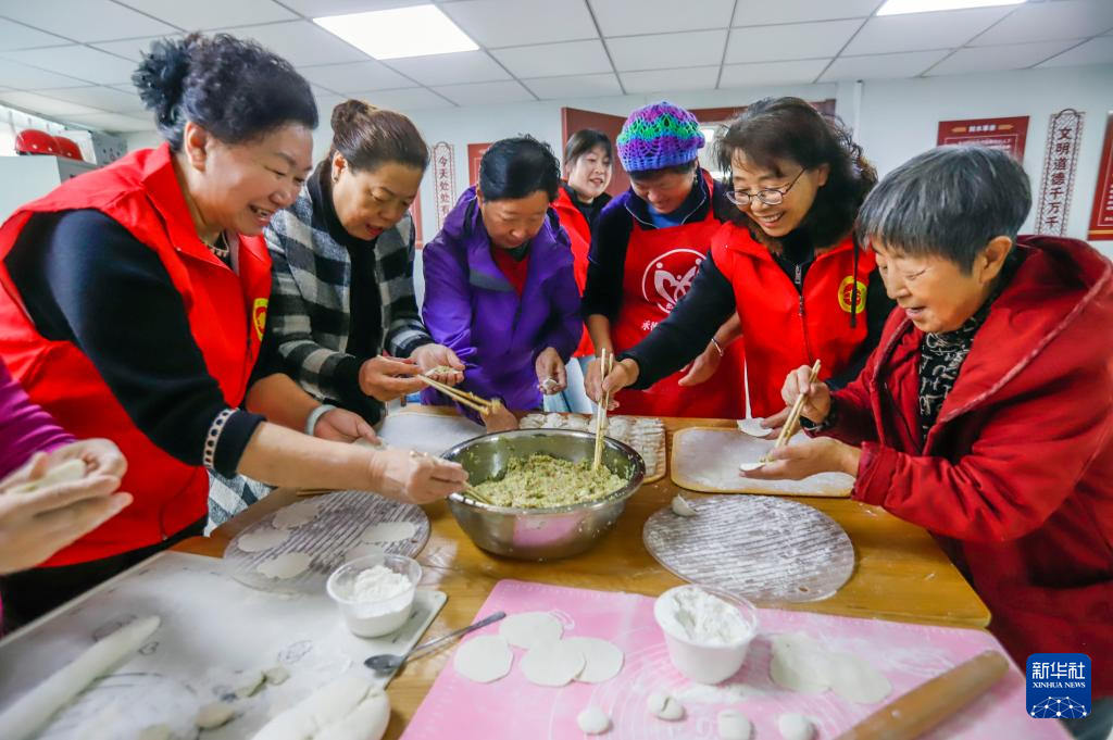 10月29日,志愿者在河北省承德市高新技术产业开发区滨河社区和老人一起包饺子。