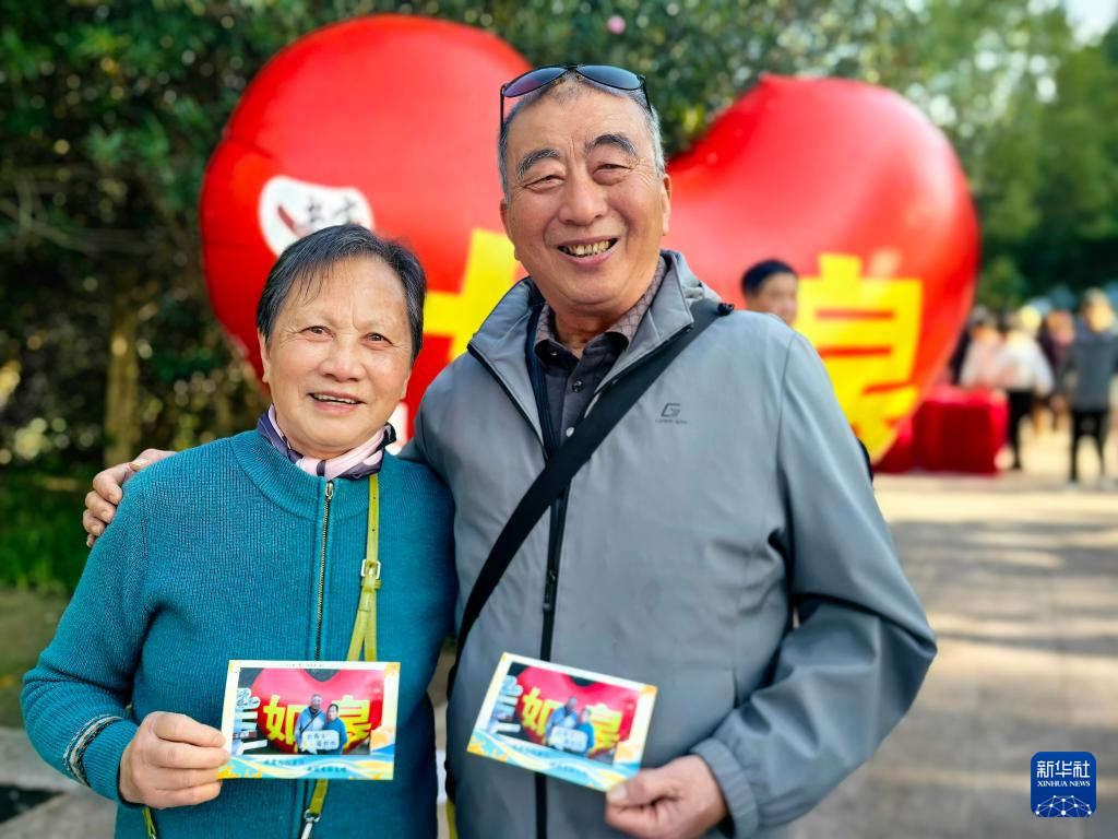 10月29日,在“我们的节日·重阳”主题文化活动江苏如皋主会场,78岁的李杰(右)和老伴展示免费领取的合影照片。