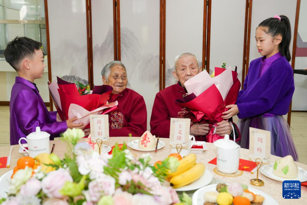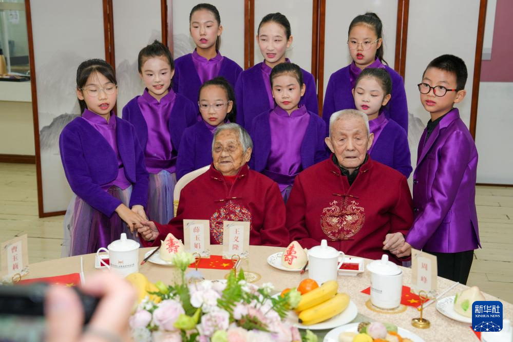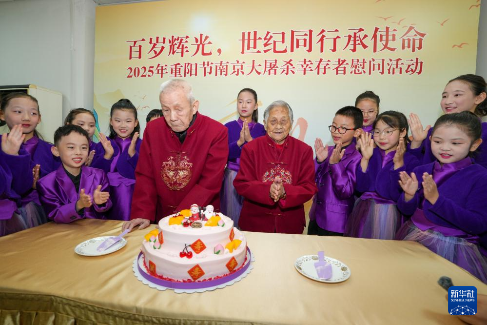 10月29日,侵华日军南京大屠杀遇难同胞纪念馆邀请两位南京大屠杀幸存者王义隆(前左)和薛玉娟(前右)共度重阳节。