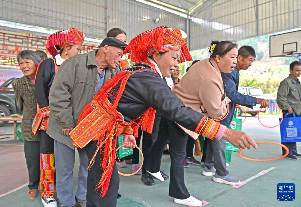 10月29日,人们在广西金秀瑶族自治县三角乡六定村参加重阳节游园活动。