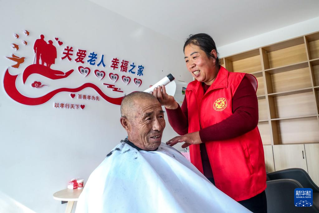 10月29日,志愿者在兰州市榆中县小康营乡郭家营村互助幸福院理发室内为村民义务理发。