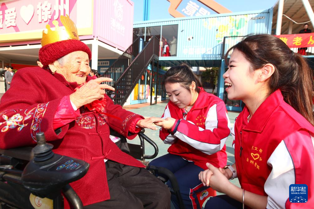 10月29日,江苏徐州高等师范学校的大学生志愿者与铜山区三堡街道潘楼村的老人聊天,为老人修剪指甲。