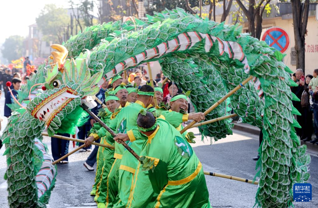 10月29日,民间艺人在浙江省湖州市德清县第十届舞阳侯会非遗巡游活动上表演舞龙,庆祝重阳节。