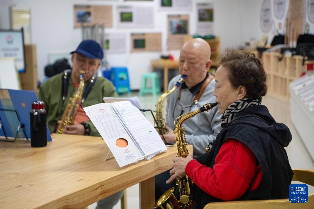 10月29日,在重庆市江北区五里店街道渝能阳光社区“享老驿站”,社区老年居民在重阳节活动上练习乐器。