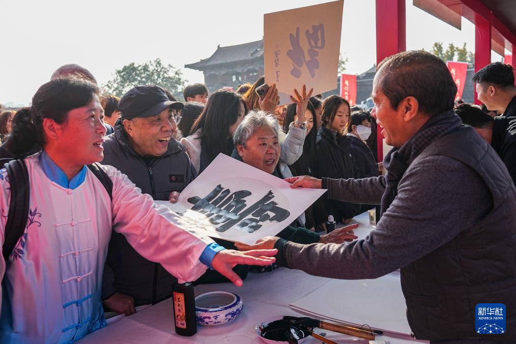 10月29日,在山东省泰安市举行的2025年全国“我们的节日·重阳”主题文化活动泰安市示范活动现场,艺术工作者为老人创作书法作品。