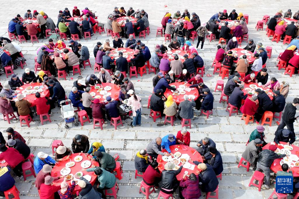 10月29日,在江苏省徐州市铜山区柳泉镇北村村,老人们围坐圆桌,共享湖鲜宴席,共度重阳佳节。