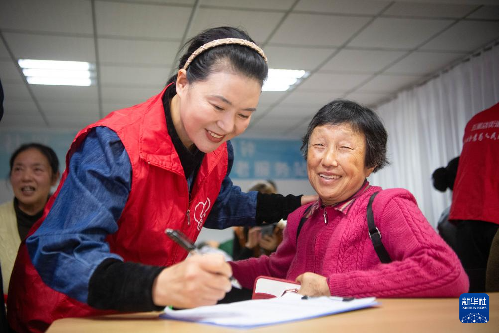 10月29日,在重庆市江北区五里店街道渝能阳光社区“享老驿站”,志愿者与老年居民交流并做健康信息记录。