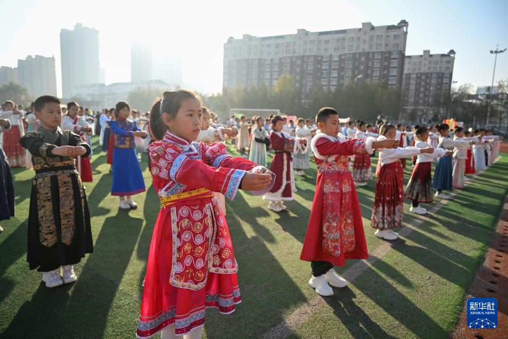 10月29日,学生在内蒙古鄂尔多斯市伊金霍洛旗第四小学操场行“拱手礼”。