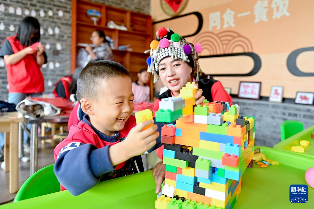 5月2日,小朋友在南涧县南涧镇西山村幸福小院内堆积木。