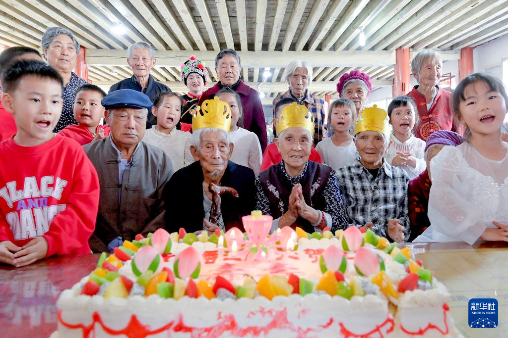 10月28日,老人在南涧县公郎镇自强村麦地平幸福小院庆祝重阳节(无人机照片)。