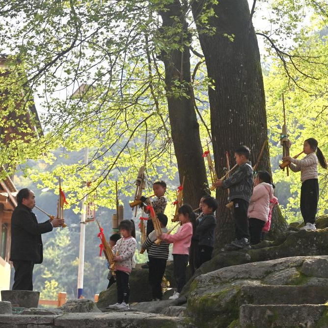 在广西柳州市融水苗族自治县杆洞乡乌英苗寨,师生们在树下吹芦笙(2025年3月28日摄)。