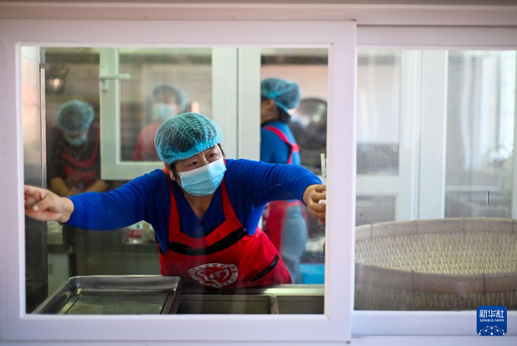 10月27日,在天津市滨海新区古林街道欣欣里社区互助食堂,王淑芹开启打饭窗口。