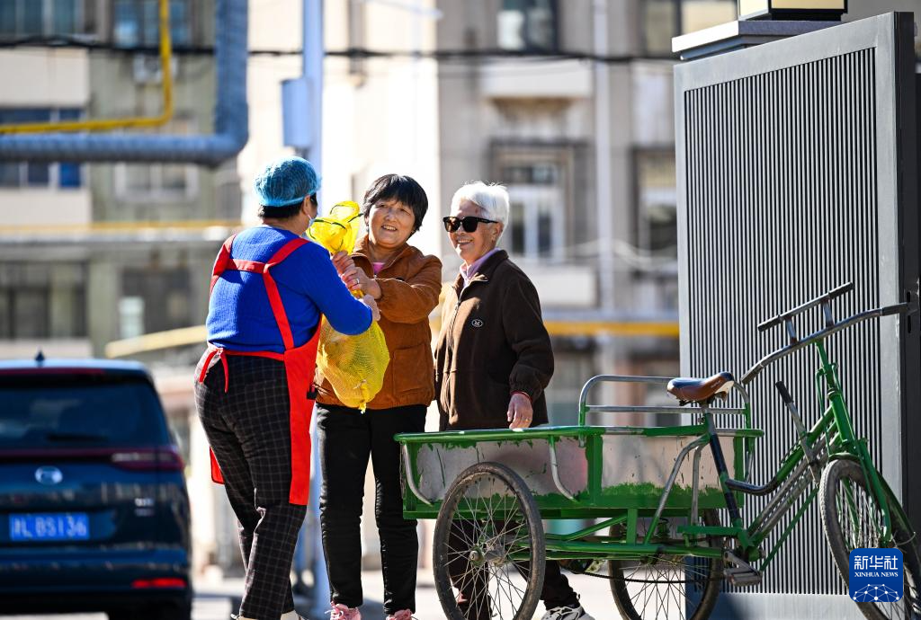 10月27日,在天津市滨海新区古林街道欣欣里社区互助食堂,前来打饭的老人们相互打招呼。
