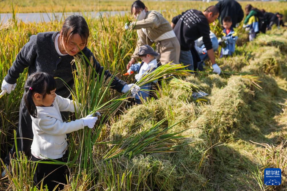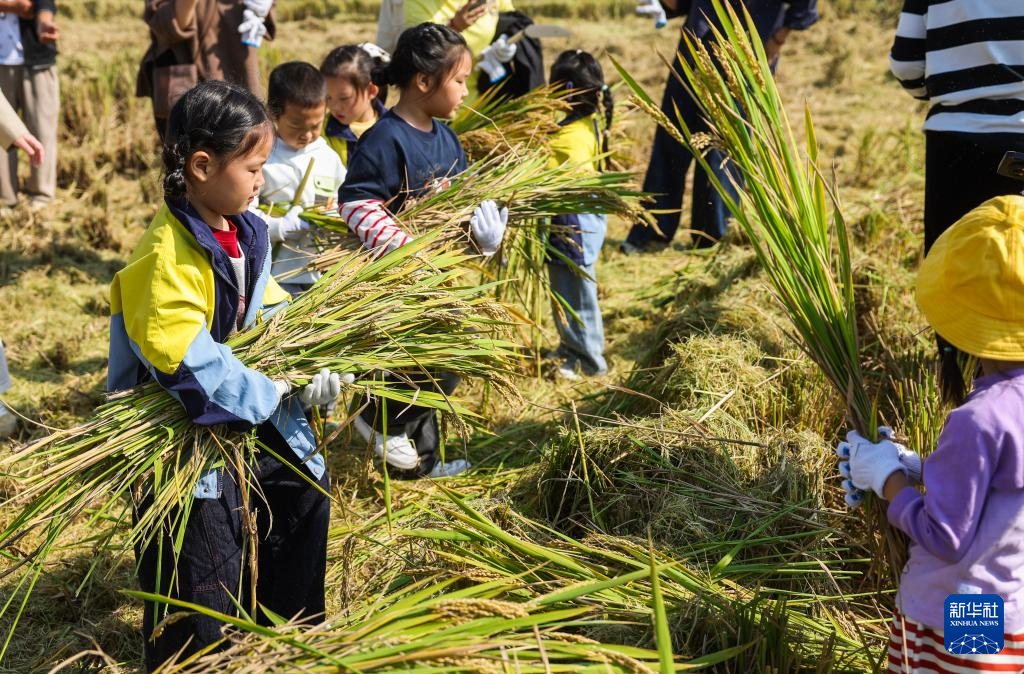 10月29日,东林镇中心幼儿园的孩子们在老师和家长的带领下在该镇保国村的水稻田里体验收获粮食。