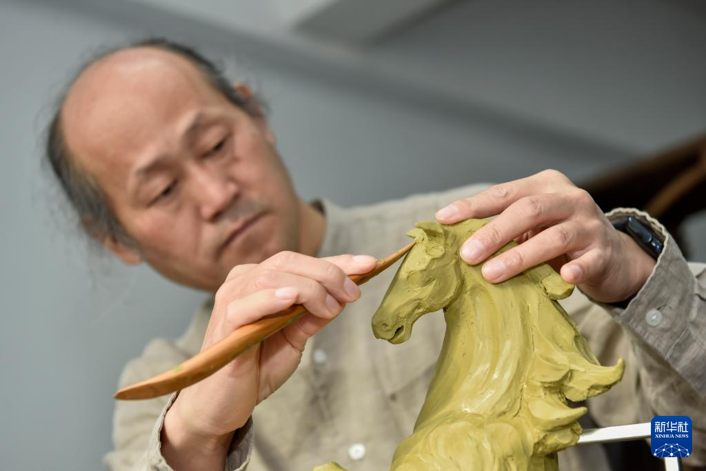 10月27日,郑东平在位于铜陵市的工作室内雕泥塑造型。