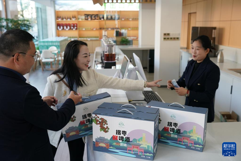 10月27日,消费者在旬阳市一家拐枣产品销售店购买拐枣啤酒。