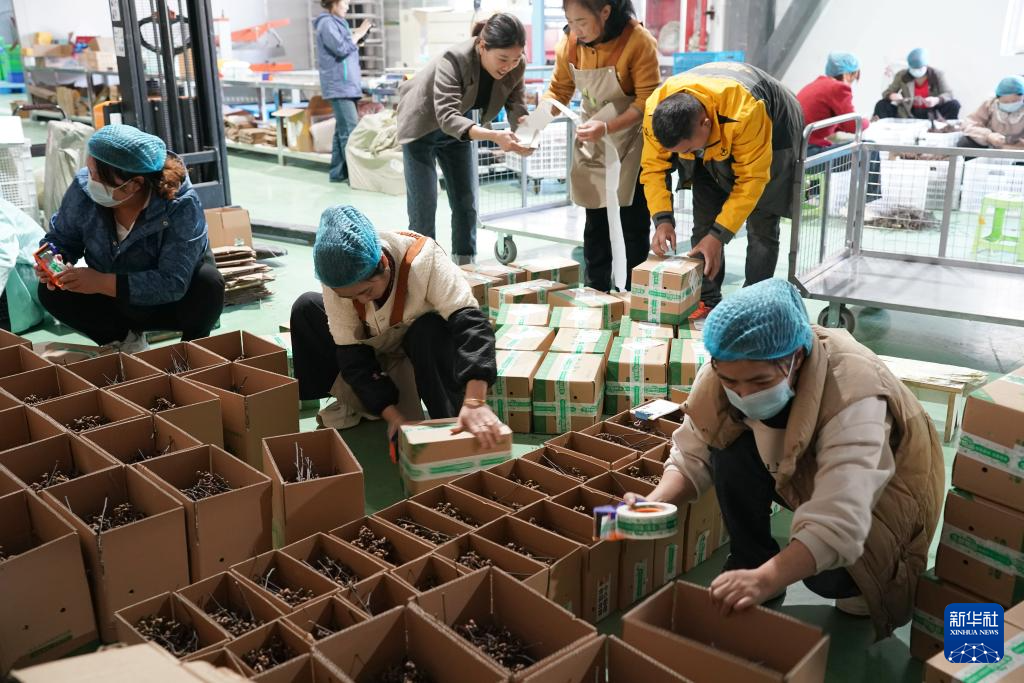 10月27日,在旬阳市一家电商企业车间,工人对拐枣进行打包。