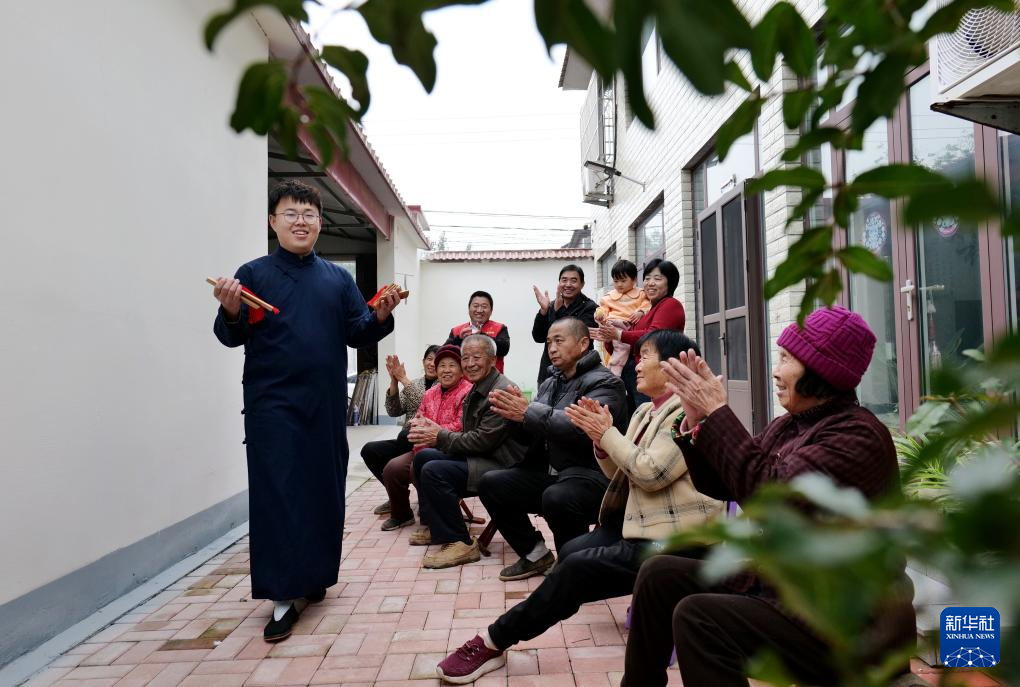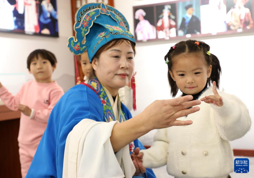 10月27日,在山东省滨州市博兴县吕艺镇“吕剧起源展览馆”,吕剧演员指导小朋友学习传统吕剧表演动作。